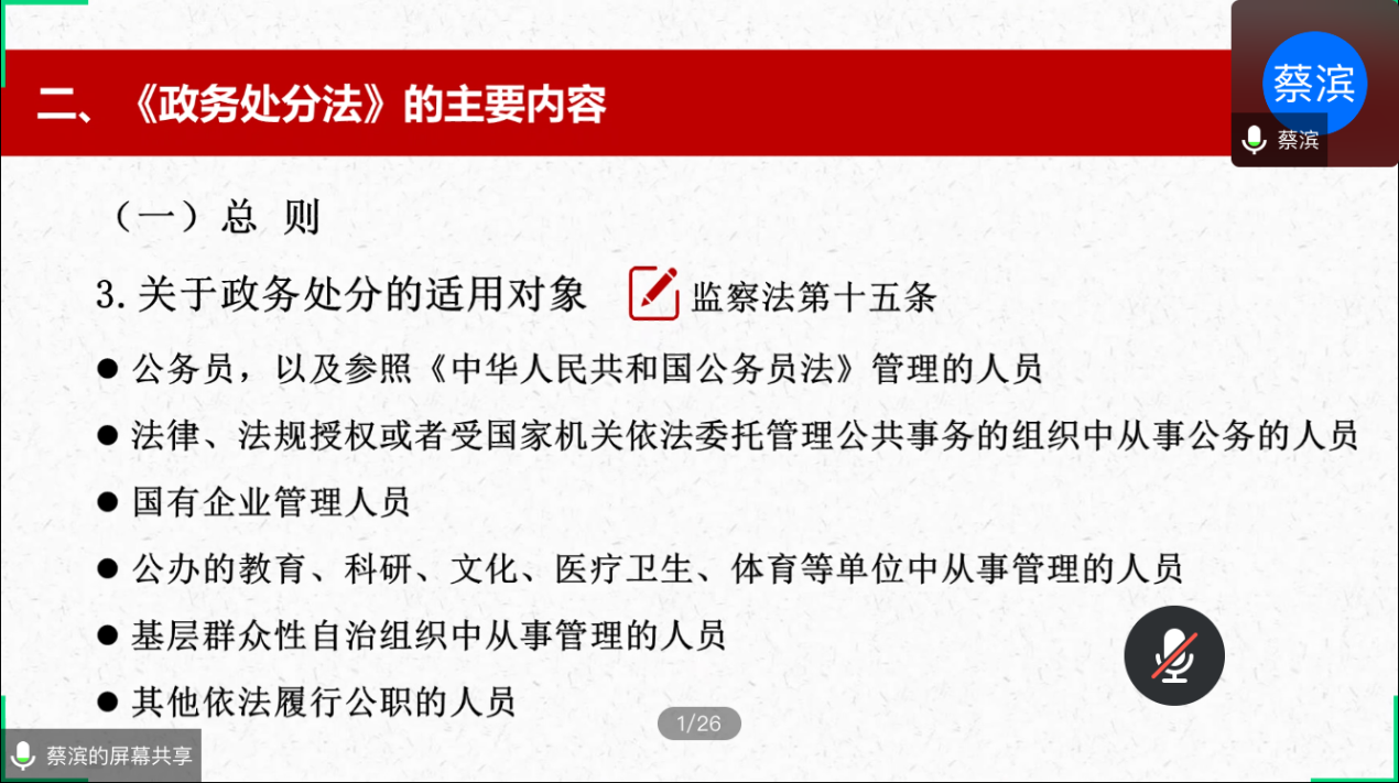 为在全院范围内掀起学习宣传贯彻《中华人民共和国公职人员政务处分法》热潮,2020年10月8日下午16:00-16:45,必赢官网纪委组织开展《中华人民共和国公职人员政务处分法》宣讲活动。活动由学院纪委书记蔡滨主持,全体教职工参加。
