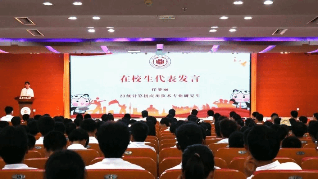 2021级研究生代表,计算机应用技术专业任梦丽同学和新生分享了自己的考研经历与研究生生活,以“博学 明理 砺志 笃行”的校训为鞭策,以遵守学术规范、提高学术道德为准则勉励新生,祝愿新生们共同开启全新旅程,向未来进发!