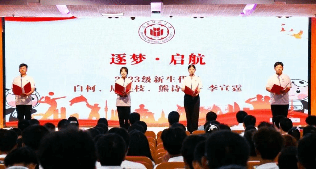来自2023级的白柯同学、周润枝同学、熊诗悦同学、李宣霆同学作为新生代表上台发言。他们表示,入学以来闽南师大人的精神风貌给他们带来了深刻的影响,他们更将以积极状态,承袭“博学 明理 砺志 笃行”的校训,不忘初心,探寻真理,在全新的舞台上扬帆启航,长风破浪,直上云端!