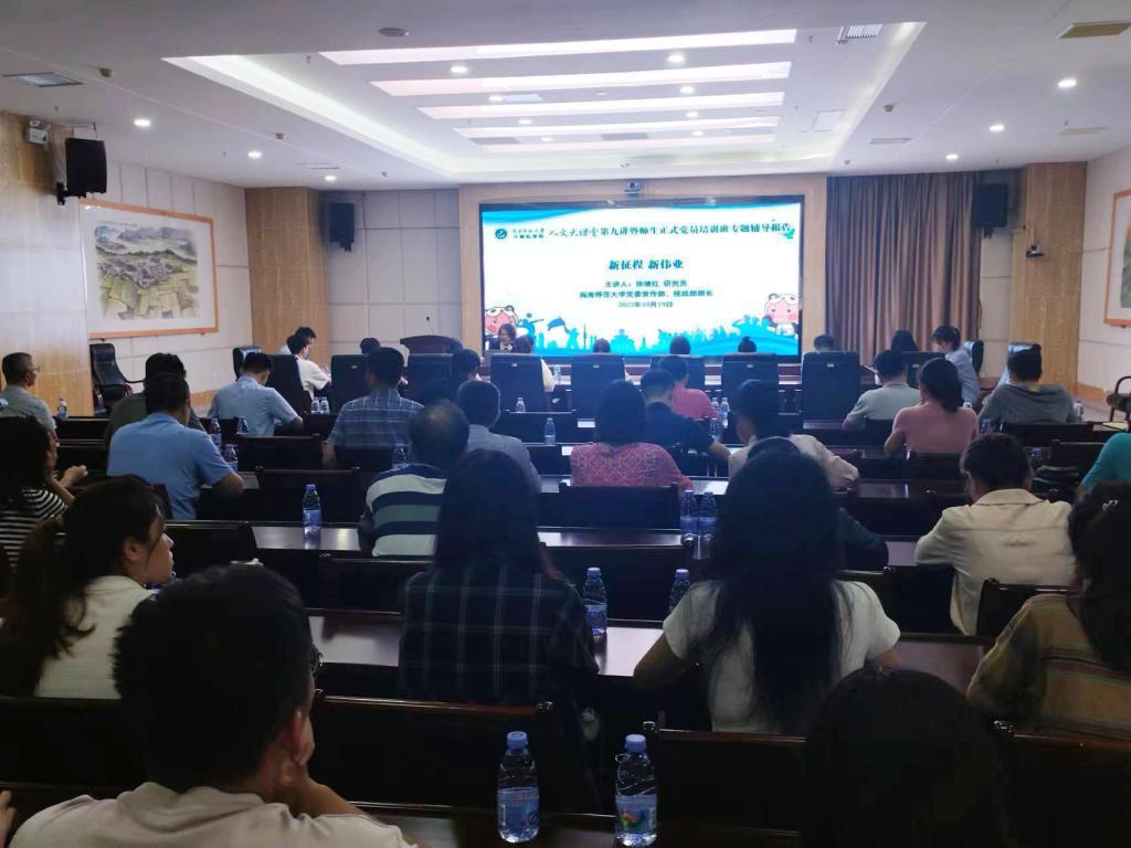 10月19日下午,必赢国际437官网在科技信息楼1607会议室举办人文大课堂第九讲暨师生正式党员培训班专题辅导报告会,学院领导班子成员、教职工党员及学生正式党员代表参加。必赢国际437官网党委宣传部、统战部部长徐继红研究员应邀作题为《新征程 新伟业》的专题辅导报告,报告会由学院党委书记祁超主持。