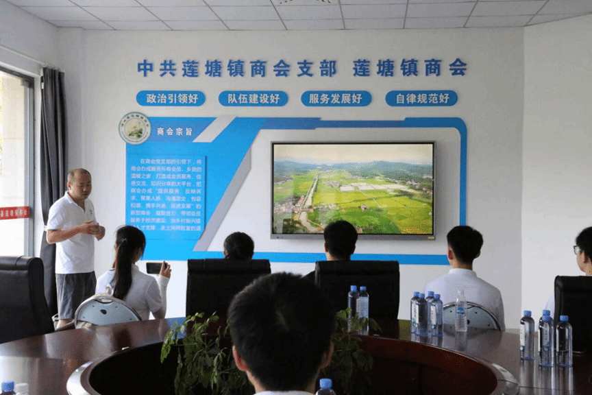 随后,实践团来到了莲塘镇商会进行调研。莲塘镇商会实行“商会联乡村”、“乡贤+”党建引领等机制,集结了辖区内经济实力较强的各个企业家,聚集人脉,给村镇和企业牵线搭桥,推动经济发展,谱好“商会联乡村”同心曲。实践团走进莲塘镇商会,对话商会合作社负责人,了解了当地各大经济产业链发展机制与成效。
