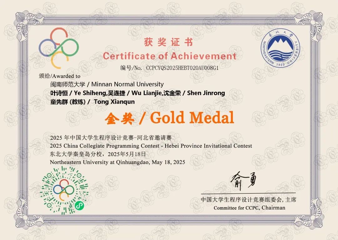 2025年5月17日至18日,由河北省教育厅主办、东北大学秦皇岛分校承办的2025年中国大学生程序设计竞赛CCPC-河北省邀请赛在东北大学秦皇岛分校顺利举行,吸引了来自全国 217支队伍参赛。我校ACM程序设计竞赛集训队(21计科1班叶诗恒、21计科1班吴连捷,21计科2班沈金荣)代表学校参赛,他们在比赛中沉着应战,凭借扎实的算法功底、出色的团队协作能力和顽强的拼搏精神,经过5小时的高强度上机编程角逐,最终脱颖而出,斩获金奖。
