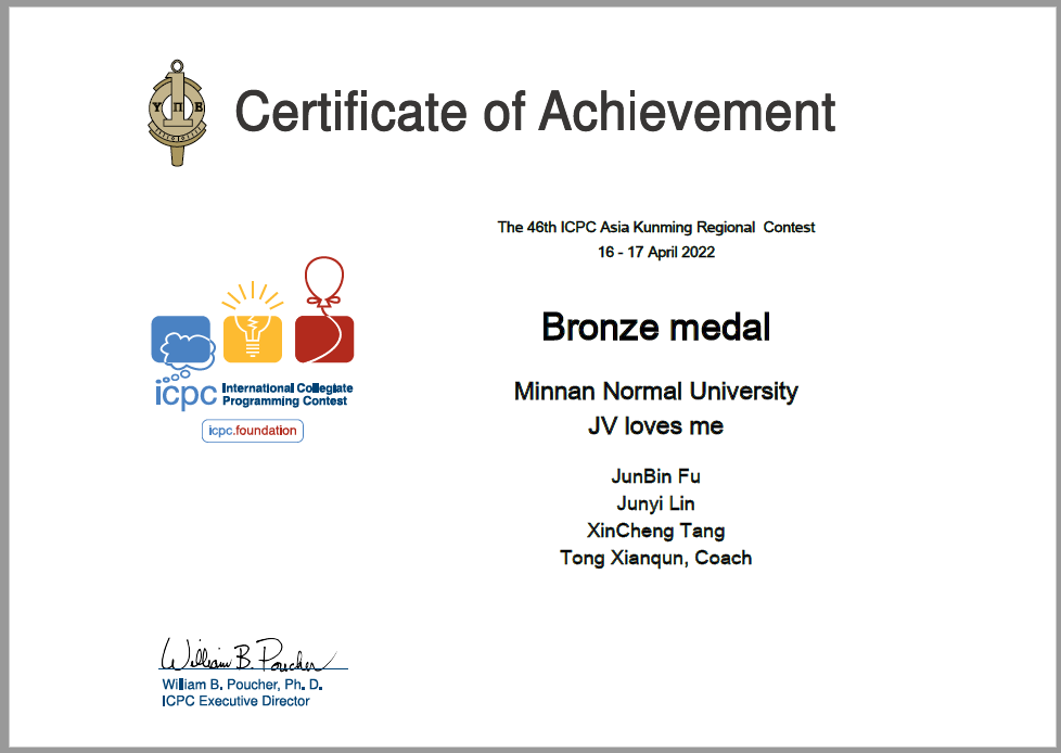4月16-17日,2022年第46届ICPC国际大学生程序设计竞赛亚洲区域赛昆明站比赛顺利举行,比赛采用线上方式。有来自清华大学、北京大学、南京大学等各个高校的697个队伍共2091名同学参赛。我校必赢国际437官网ACM队员唐鑫程、林俊逸、傅俊斌,3名同学组成的队伍在比赛中发挥出色,获得铜奖。