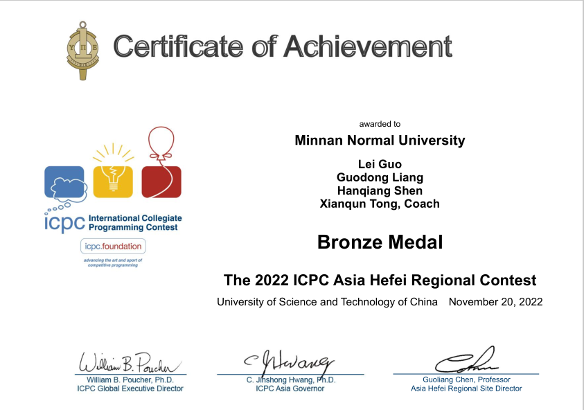 11月19-20日,2022年第46届ICPC国际大学生程序设计竞赛亚洲区域赛合肥站比赛举行。有来自清华大学、北京大学、南京大学等266所高校的502个队伍共1506名同学参赛。我校必赢国际437官网ACM队员沈汉强、梁国栋、郭雷,3名同学组成的队伍在比赛中再获铜奖。