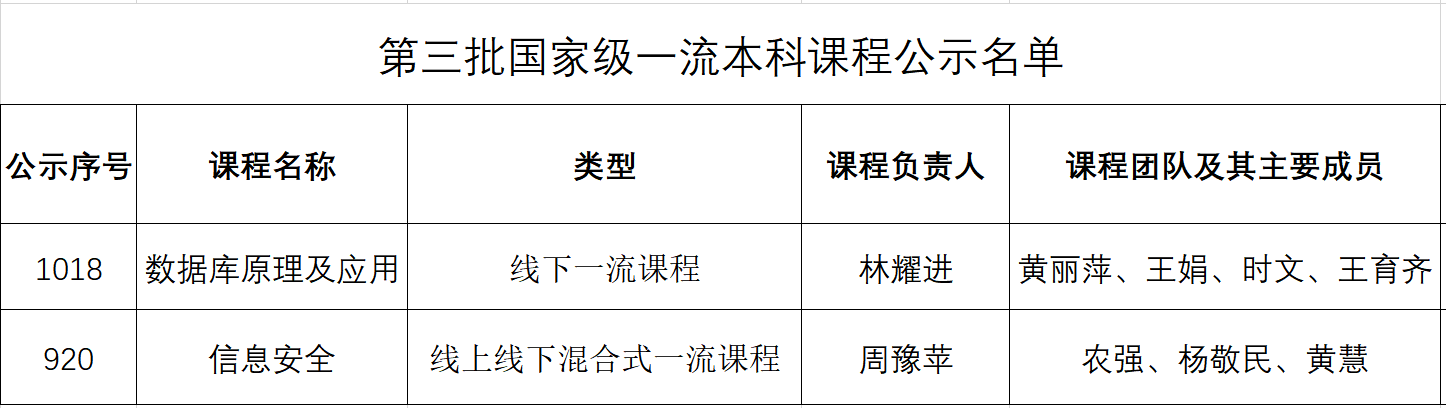 近日,教育部高等教育司发布了《关于第三批国家级一流本科课程认定结果的公示》,必赢官网林耀进教授负责的线下课程《数据库原理及应用》和周豫苹教授负责的线上线下混合课程《信息安全》入选国家级一流本科课程。
