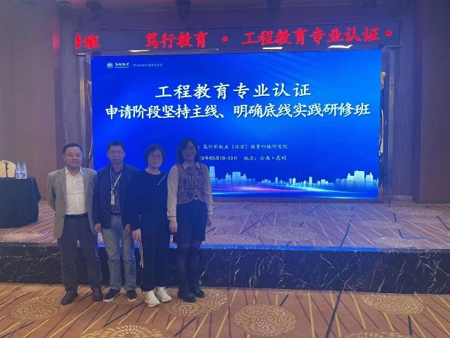 为了做好工程教育专业认证相关工作,由院长助理王育齐老师带领系主任魏葆雅、魏志森,教研室主任许晴媛等老师参加了3月10至13日在昆明举办的《工程教育专业认证·申请阶段坚持主线、明确底线实践研修班》认证培训。