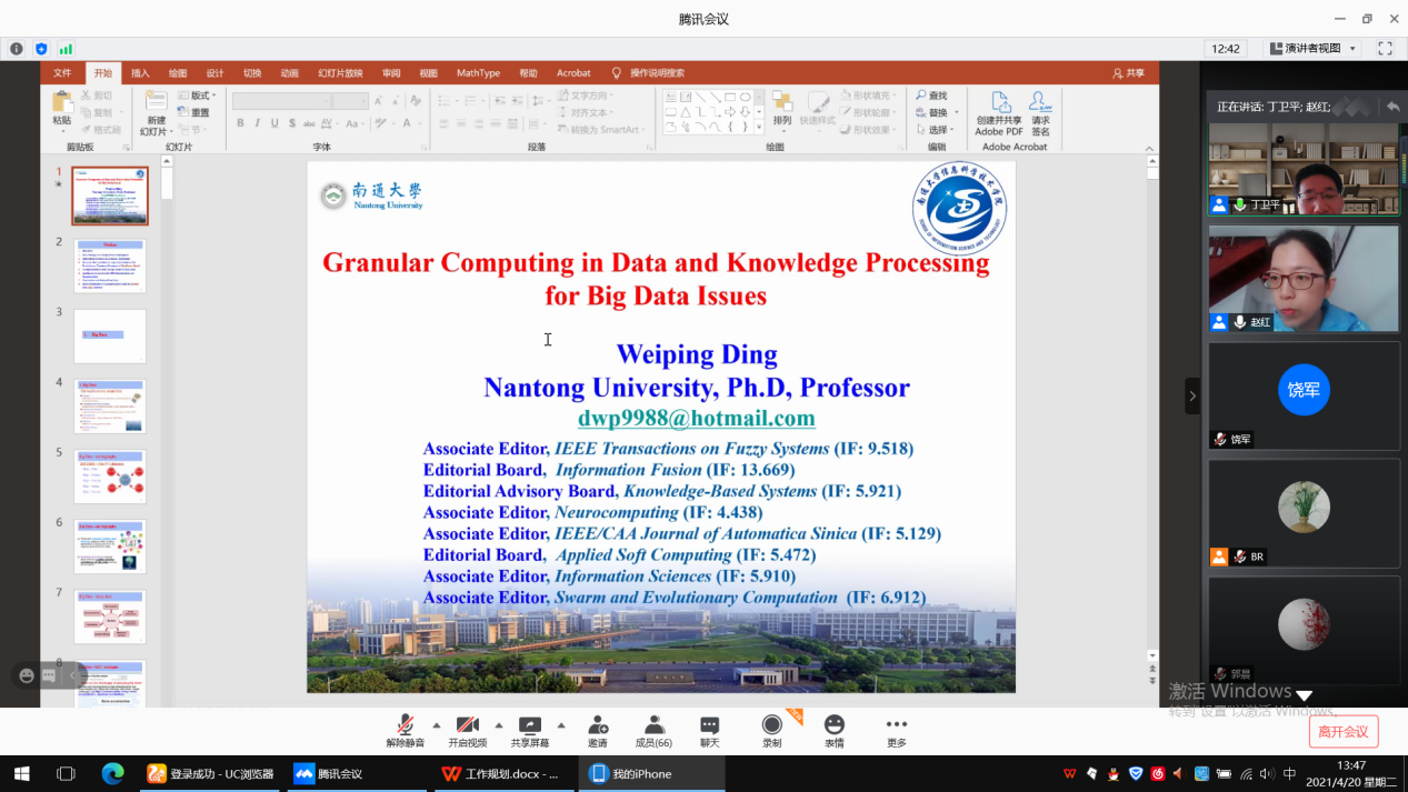 4月20日下午,必赢国际437官网在线上举行了“Granular Computing in Data and Knowledge Processing for Big Data Issues”学术报告,主讲人为南通大学信息科学技术学院副院长、博士生导师丁卫平教授。讲座由赵红教授主持,学院相关方向教师和全体研究生参加了本次报告会。