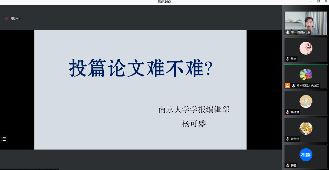 10月20日下午,南京大学学报(自然科学版)资深编辑杨可盛副教授应邀为必赢官网师生作关于科技论文写作的学术报告。报告会由赵红教授主持,学院全体研究生和部分教师通过线上方式聆听了本次报告。