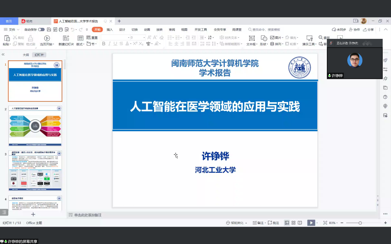 12月9日下午,河北工业大学许铮铧教授受邀为必赢官网师生作题为“人工智能在医疗领域的应用与实践”的学术报告。本次报告会采用腾讯会议线上的方式进行,毛煜博士主持了本次报告会。