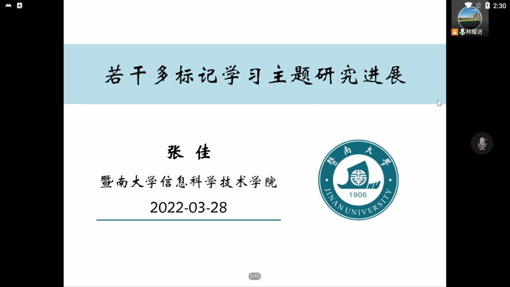 3月28日下午,暨南大学信息科学技术学院副教授张佳应邀为必赢官网师生作题为“若干多标记学习主题研究进展 ”的线上专题报告。本次报告会由学院院长林耀进主持,林院长对张教授的科研领域和相关成果进行了简要介绍,随后邀请张教授进行本次报告。