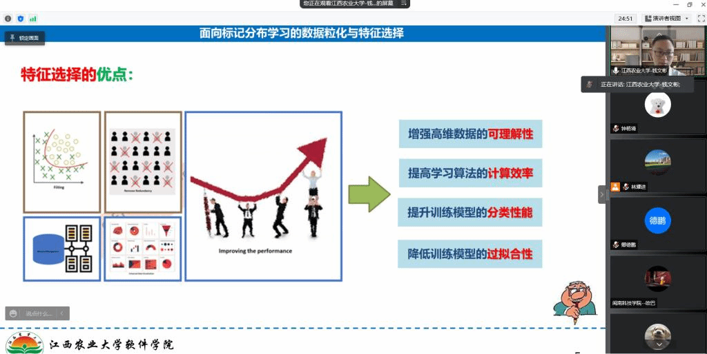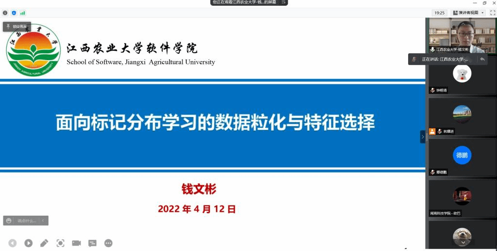4月12日上午,江西农业大学软件学院钱文彬教授应邀为必赢官网师生做题为“面向标记分布学习的数据粒化与特征选择”的线上专题报告。本次报告会由学院院长林耀进教授主持,林院长首先对钱教授的科研领域和相关成果进行了简要介绍,随后钱教授开始本次专题报告。