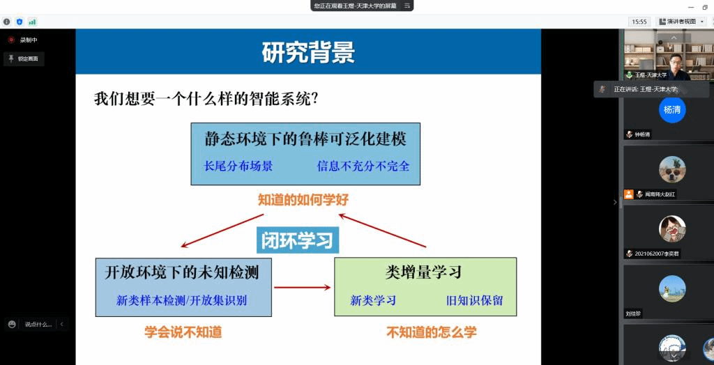 王老师首先简单介绍了本次报告的主题,指出当前机器学习模型大多基于静态固定环境假设,即类别确定、样本充足、模型固定,真实场景往往为不确定的大规模动态开放环境,这为机器学习建模提出一系列新的挑战。然后详细介绍和归纳了当前的三个关键挑战,一是模式复杂而待建模样本数量有限。二是不识未知,无法获取未知类信息,难以对其进行有效识别。三是学新忘旧,缺少足够的旧类样本,模型难以保持先前知识。最后,通过结构化建模的方式提出解决上述挑战的一些思路和方案并进行讨论。