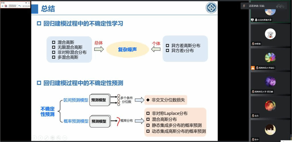汪老师从开放环境的背景出发,介绍了数据中包含很多不确定性,如数据缺失、数据异常以及数据噪声等概念。围绕不确定性的学习和预测两个视角出发,结合实际数据特性及任务需求,介绍如何在回归建模的过程中自适应学习已知样本中的复杂不确定性特性,解决不确定性假设与实际情形不一致的问题,以及如何预测未知样本上的复杂不确定性,提高决策的可靠性。此外,汪老师还介绍了他们团队在相关方面的研究思路,并对此研究领域的后续探索进行了展望。