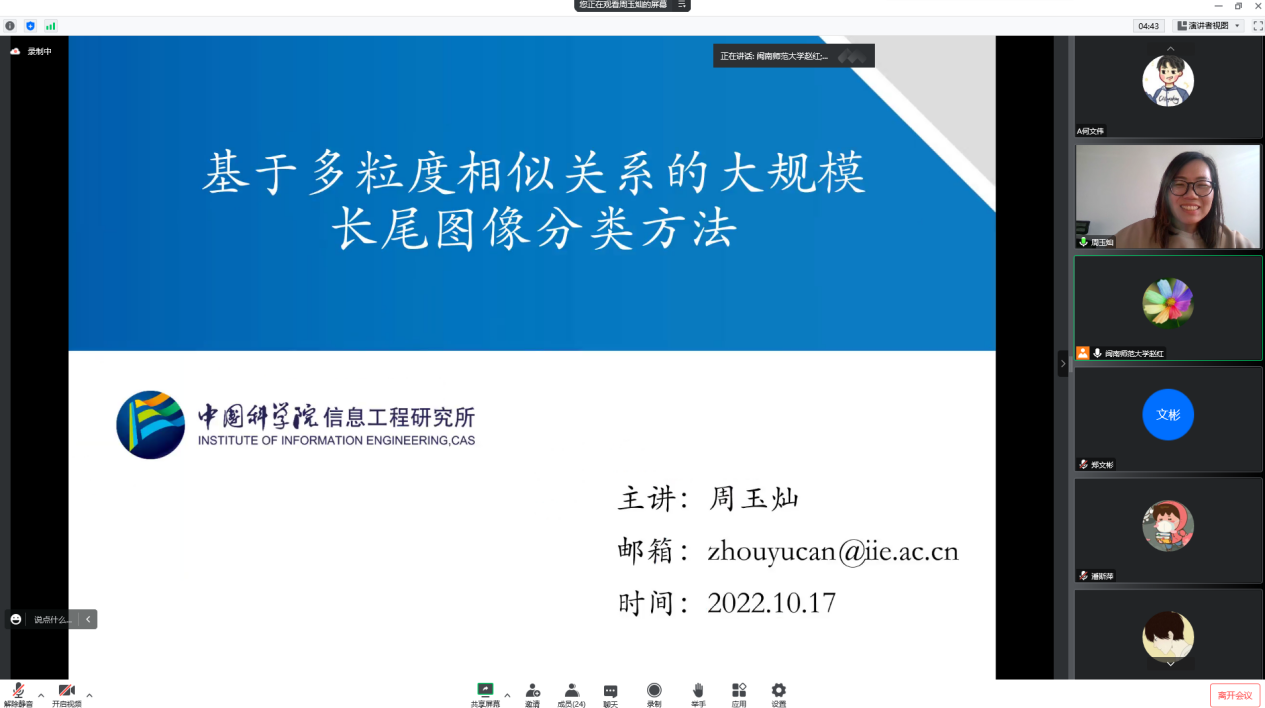 10月17日下午,中国科学院信息工程研究所助理研究员周玉灿应邀为必赢官网师生做线上专题报告“基于多粒度相似关系的大规模长尾图像分类方法”。