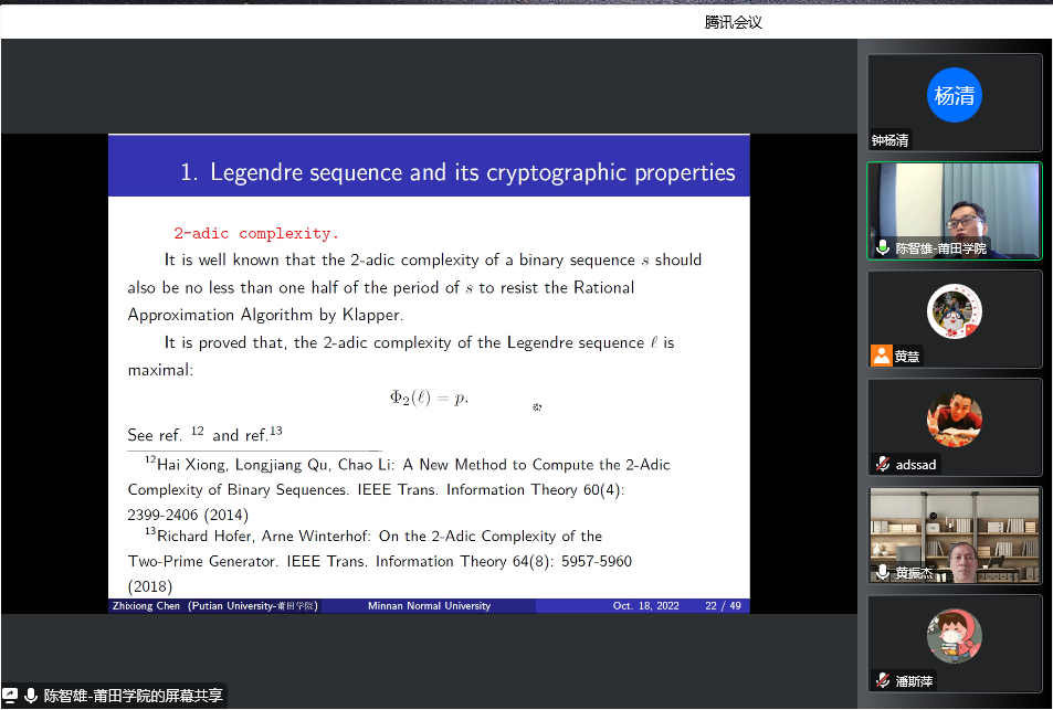 首先,陈智雄教授分享了关于研究生学习的一些感悟,主要是多读、多想、多写。随后,陈教授介绍了Legendre序列及其推广的相关内容,详细介绍了Legendre序列及其密码性质、Legendre序列研究进展、Legendre序列的推广应用等,为必赢官网师生的学习和研究提供了一些新的思路和想法。