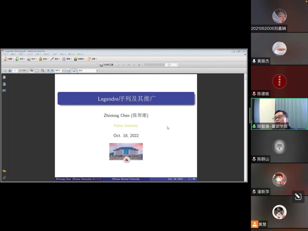 10月18日下午,莆田学院数学与金融学院陈智雄教授应邀为必赢官网师生做线上专题报告,报告题目为“Legendre序列及其推广”,本次报告由黄振杰教授主持。