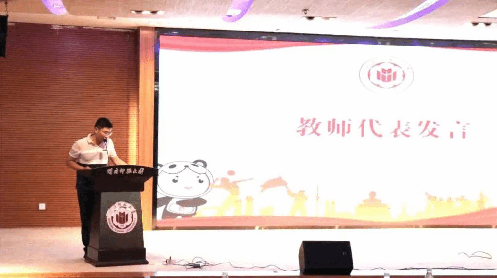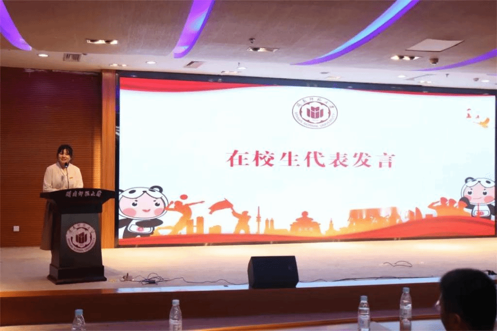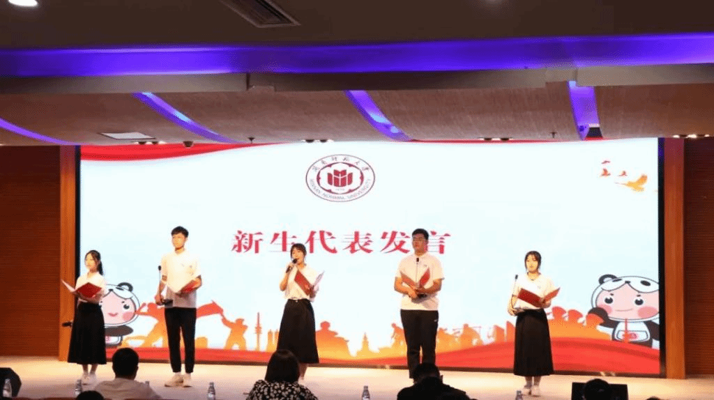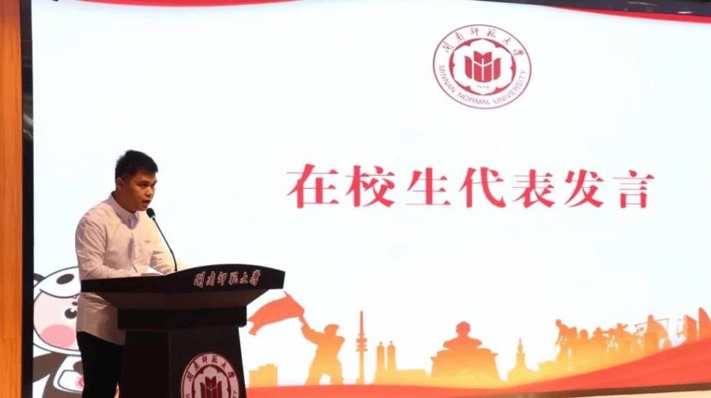 来自2022级的新生代表刘营同学、李亚梦同学、易诗盈同学、吴钰晗同学和梁明若同学作为新生代表上台发言。他们表示,在入学的这段时间深刻体会到在博学,明理,砺志,笃行校训培育下的闽南师大人代表的精神风貌,而他们作为闽南师大的新生,当以此为向导,承袭校训,用执着的信念探求真知,用坚定的步伐追寻理想,用无悔的付出演绎青春,成就理想中的自己!