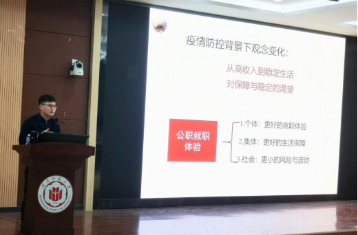 吴老师向同学详细介绍了应届毕业生报考选调生和公职岗位的相关要求、流程、技巧等。吴老师还强调,“为中国人民谋幸福,为中华民族谋复兴”是中国共产党人的初心和使命,是激励一代代中国共产党人前赴后继、英勇奋斗的根本动力。对于每个奔赴基层的党员而言,宗旨观念、服务意识一刻也不能忘,同学们要立志于用正好的青春在基层扎根,用赤子之心去亲民为民取信于民。