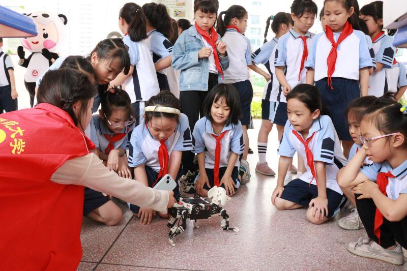 必赢国际437官网的大学生们向中小学生展示智能车、机器狗等科技设备。